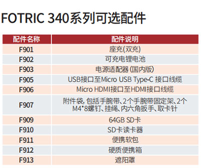 紅外熱像儀主機、鏡頭、鏡頭蓋、可充電鋰電池2塊、座充、電源適配器、USB Type-C至USB接口線纜、Micro HDMI接口至HDMI接口 線纜、SD卡、SD卡du ka qi、附件袋(手腕帶、2個手腕帶固定架、2個M4*8螺釘、掛繩、內(nèi)六角扳手、取卡針)、資料袋(裝箱單、標(biāo)定證書、 用戶手冊、合格證、保修卡、光盤)、便攜軟包、硬質(zhì)便攜箱。