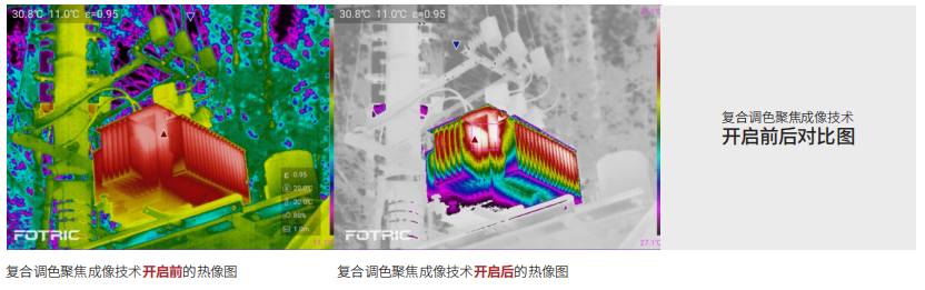 FOTRIC自有的復(fù)合調(diào)色聚焦成像技術(shù),其出色的熱成像效果,非常適用于復(fù)雜場景中分析特定目標的細微溫差,有利于現(xiàn)場快速得出正確的診斷結(jié)論(FOTRIC自有技術(shù))。