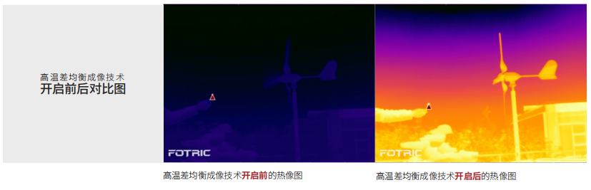 FOTRIC自有的高溫差均衡成像技術(shù),可以在高溫差場景中,清晰顯示所有目標的熱梯度(FOTRIC自有技術(shù))。