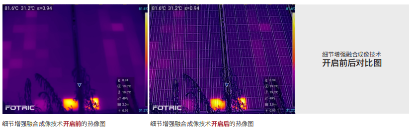 FOTRIC自有的細節(jié)增強融合成像技術(shù),支持在熱像圖上融合可見光輪廓細節(jié),輕松定位故障的具體位置(FOTRIC自有技術(shù))。