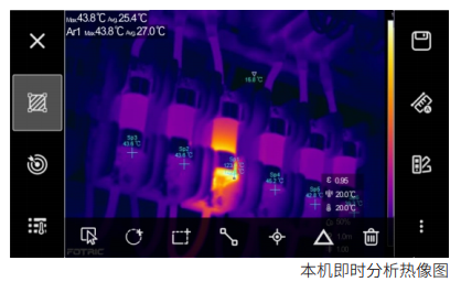 FOTRIC 368C支持拍攝后熱像圖在本機即時分析。避免重復(fù)拍攝,方便快捷。支持高低溫自動捕捉,可添加高達5個測溫點、5個測溫區(qū)域與5條測溫線同時測量。