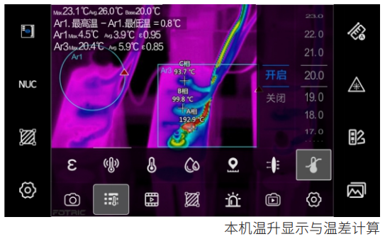 本機可以通過設(shè)置基準溫度實現(xiàn)全畫面所有測溫點溫度顯示為實際溫度減去基準溫度后的溫升溫度,方便溫升篩查;也可以通過溫差功能來計算任意測溫標識的溫差或任意測溫標識與參考溫度的溫差。