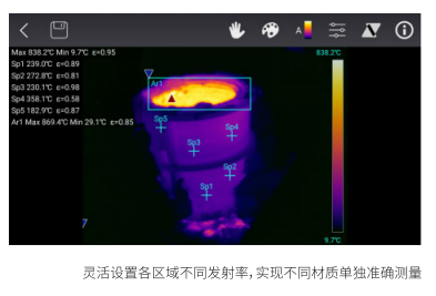 本機與PC軟件都可以設(shè)置各區(qū)域不同發(fā)射率,實現(xiàn)不同材質(zhì)單獨準(zhǔn)確測量。同時可對透過率、測試距離等進行設(shè)置,保證溫度的準(zhǔn)確性。