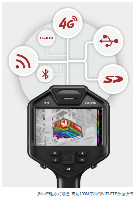 FOTRIC 330M系列紅外熱像儀提供豐富的數(shù)據(jù)傳輸接口,包含WiFi-FTP數(shù)據(jù)快傳,Type-C USB3.0有線傳輸,高速SD卡傳輸,4G傳輸以及HDMI、藍(lán)牙接口。