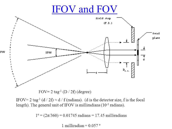 瞬時(shí)視場(chǎng)角指的是傳感器內(nèi)單個(gè)探測(cè)元件的受光角度或觀測(cè)視野,它決定了在給定高度上瞬間觀測(cè)的地表面積,這個(gè)面積就是傳感器所能分辨的最小單元。IFOV越小,最小可分辨單元越小,圖像空間分辨率越高。IFOV取決于傳感器光學(xué)系統(tǒng)和探測(cè)器分辨率的大小。