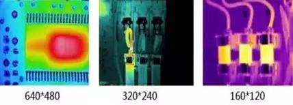 首先,要確定購買紅外熱像儀的像素級別,大多紅外熱像儀的級別和像素有關。民用紅外熱像儀中相對高端的產(chǎn)品像素為640*480=307,200,此高端紅外熱像儀拍攝的紅外圖片清晰細膩,在12米處測量的最小尺寸是0.5*0.5cm;中端紅外熱像儀的像素為320*240=76,800,在12米處測量的最小尺寸是1*1cm;低端紅外熱像儀的像素為160*120=19,200,在12米處測量的最小尺寸是2*2cm。可見像素越高所能拍攝目標的最小尺寸越小,下圖所示為三個級別像素紅外熱圖片的比較: