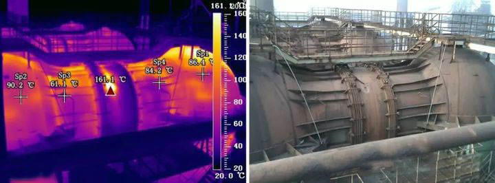 有耐火材料出現(xiàn)裂縫、脫落、局部減薄等缺陷,會把局部耐高溫材料內(nèi)部的高溫傳遞給爐壁,從而使熱風爐爐皮的表面溫度場分布不均勻。紅外熱像儀可以測出過熱區(qū)的最大溫度、過熱區(qū)大小及位置,從而可以判斷出襯里缺陷部位,缺陷嚴重程度、缺陷面積大小等。