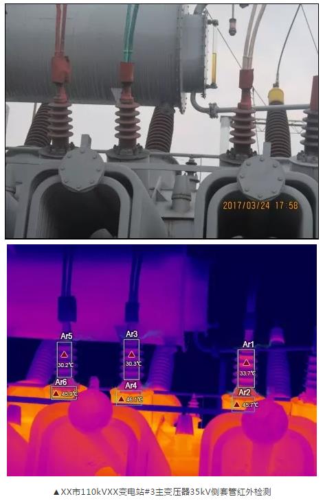 但是,電壓致熱型缺陷極難發(fā)現(xiàn)。主要原因有3個(gè),其一:溫差太小,一般熱像儀很難發(fā)現(xiàn)如此小的溫差,而普通熱像儀的驗(yàn)收標(biāo)準(zhǔn)是允許溫差2度,這本身就已經(jīng)達(dá)到缺陷的閾值了;其二:套管在變壓器上,變壓器本身溫升很高,是一個(gè)強(qiáng)大的干擾源,很容易掩蓋套管本身存在的溫差;其三:對(duì)現(xiàn)場(chǎng)人員的技術(shù)要求較高,除現(xiàn)場(chǎng)查閱規(guī)范、計(jì)算溫度外,也需要他具備豐富的經(jīng)驗(yàn)和專業(yè)的故障判斷能力。