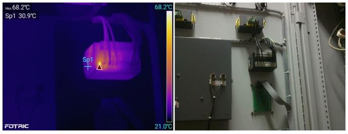 這是一個(gè)開關(guān)盒,熱像儀測出高溫點(diǎn)(紅三角處)達(dá)68.2℃,而盒體的正常溫度只有30.9℃,表明存在異常。高溫點(diǎn)位置在A接頭附近,假如是接頭異常導(dǎo)致,那么接頭那根線將會(huì)呈現(xiàn)溫度遞減的現(xiàn)象,而圖中并非如此,且最高溫并未與A接頭完全重合,由此判斷,可能是內(nèi)部問題。