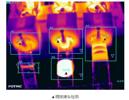 3、在夏天和冬天檢測某電氣接頭,都測出60℃,那么所反映出的設(shè)備狀況一樣嗎?當(dāng)然不是,因?yàn)榄h(huán)境溫度不同,夏天為32℃,而冬天是-5℃。通過FOTRIC 360系列的“全屏溫升計(jì)算功能”,可以自動(dòng)得出,該電氣接頭在夏天溫升為28℃,冬天的溫升為65℃,說明冬天存在故障隱患。