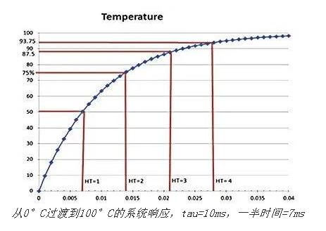從0°C過渡到100°C的系統(tǒng)響應,tau=10ms,一半時間=7ms